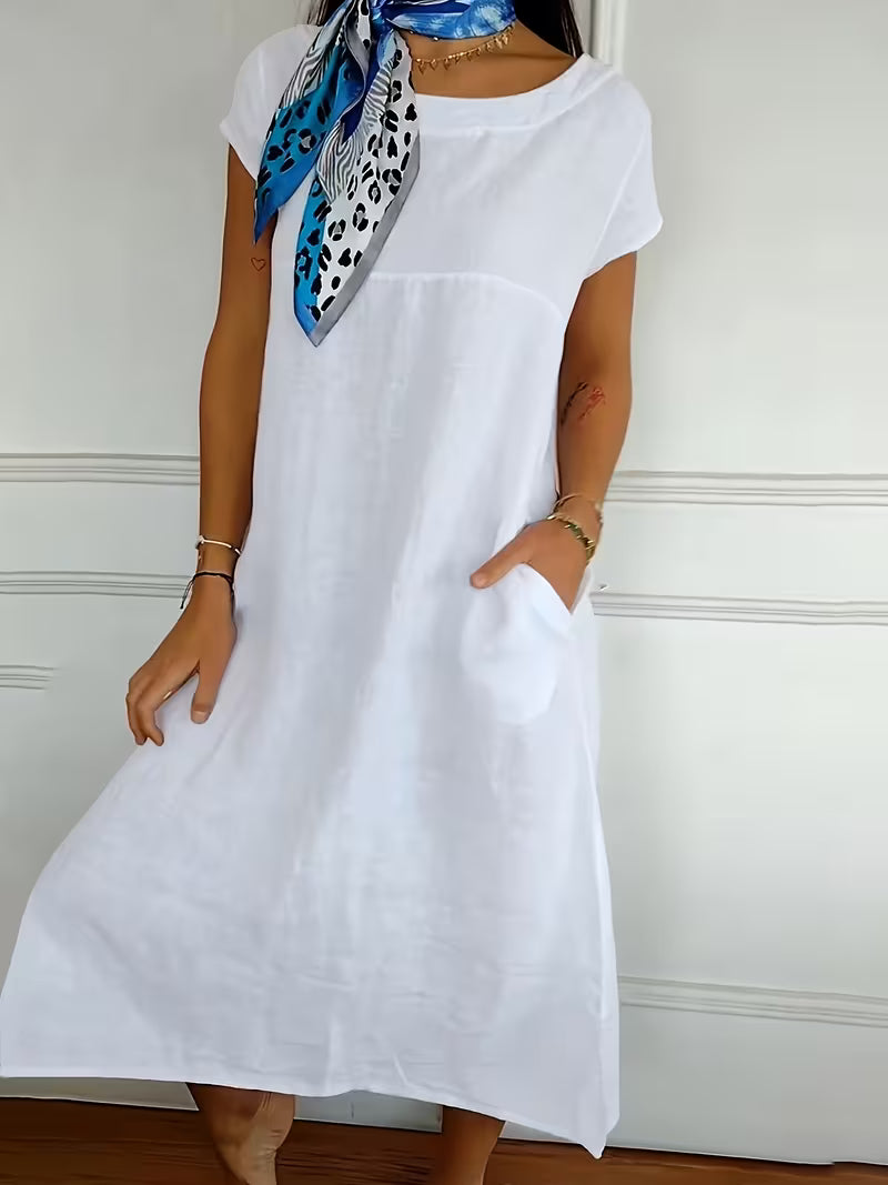 Du får en tidlös silhuett med diskreta sidfickor, en rak passform och korta ärmar som ger rörelsefrihet och en naturligt smickrande look.