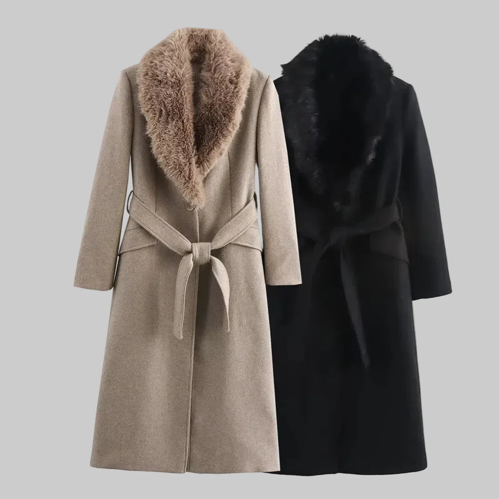 Omfamna stil och komfort med denna pälskragekappa. Med sin mjuka textur, flatterande passform och tidlösa elegans blir den ett perfekt val för kvinnor som vill känna sig sofistikerade och värma under kyliga dagar.